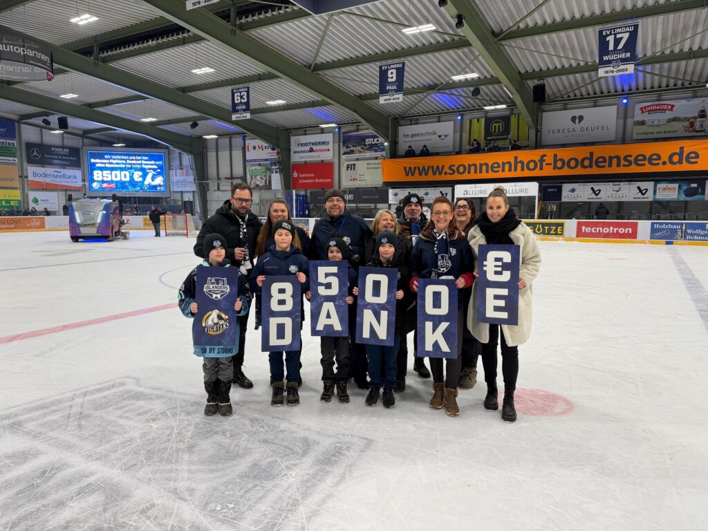 Mit einem erneut großartigen Erlös endete die große Tombola des EVL-Fanclubs Bodensee Fighters zugunsten der Nachwuchsabteilung der EV Lindau Islanders. Sage und schreibe 8.500 Euro kamen durch den Losverkauf im vergangenen Dezember zusammen. Am 16. Januar beim Derby gegen die ECDC Memmingen Indians übergaben die Mitglieder des Fanclubs, mit Vorstand Sven Szczery an der Spitze, die Summe symbolisch an Patrick Meier, Marketingvorstand der Islanders.